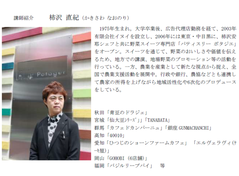 柿沢安耶さんが諸事情により講演できないため、共に野菜スイーツ専門店「パティスリー ポタジエ」を運営している柿沢直紀さんにご講演して頂きます。